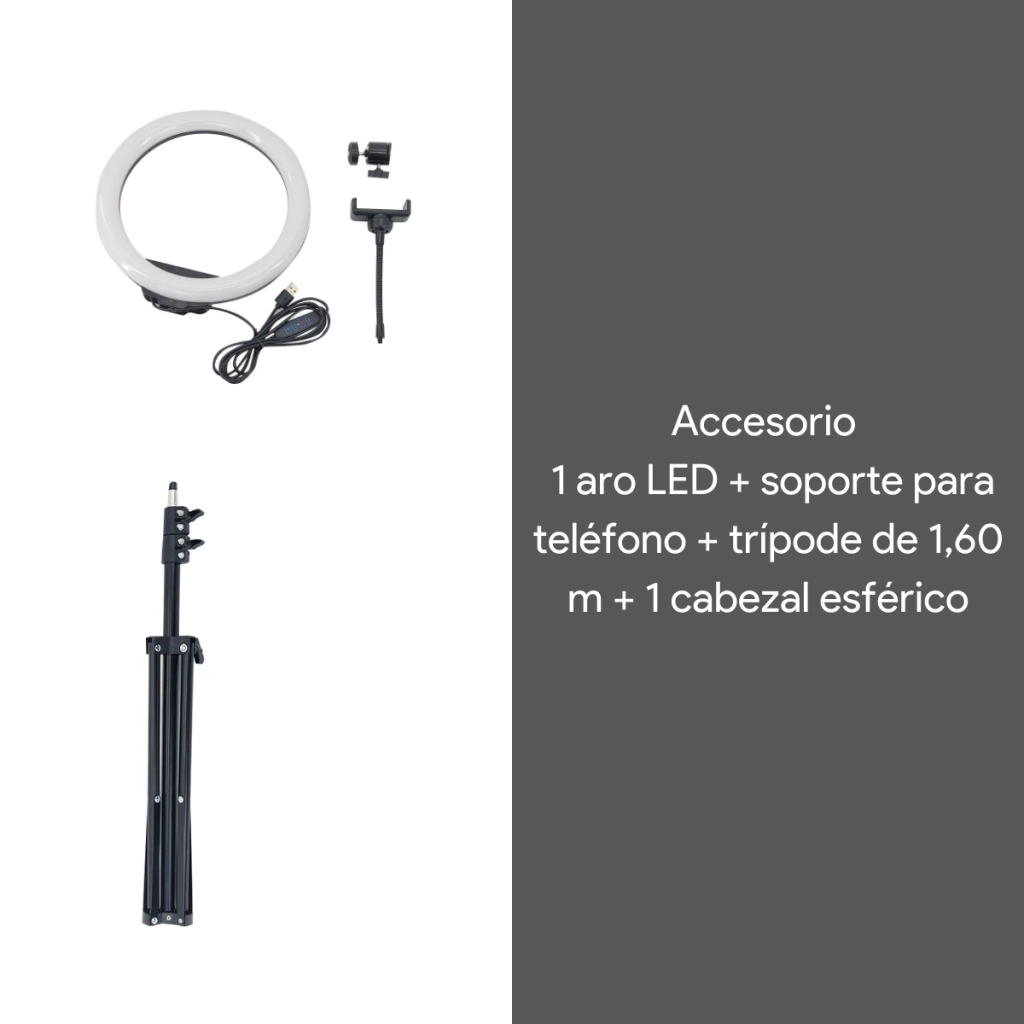 Accesorio de embalaje: 1 aro LED + soporte para teléfono + trípode de 1,60 m + 1 cabezal esférico