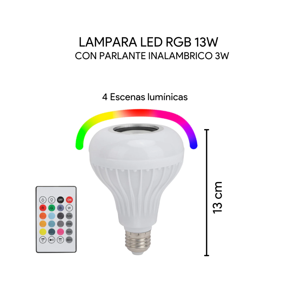 Control remoto: cambio de colores, intensidad, encendido, apagado, 4 escenas lumínicas, control de volumen, pausa, saltar canción (incluye pila)